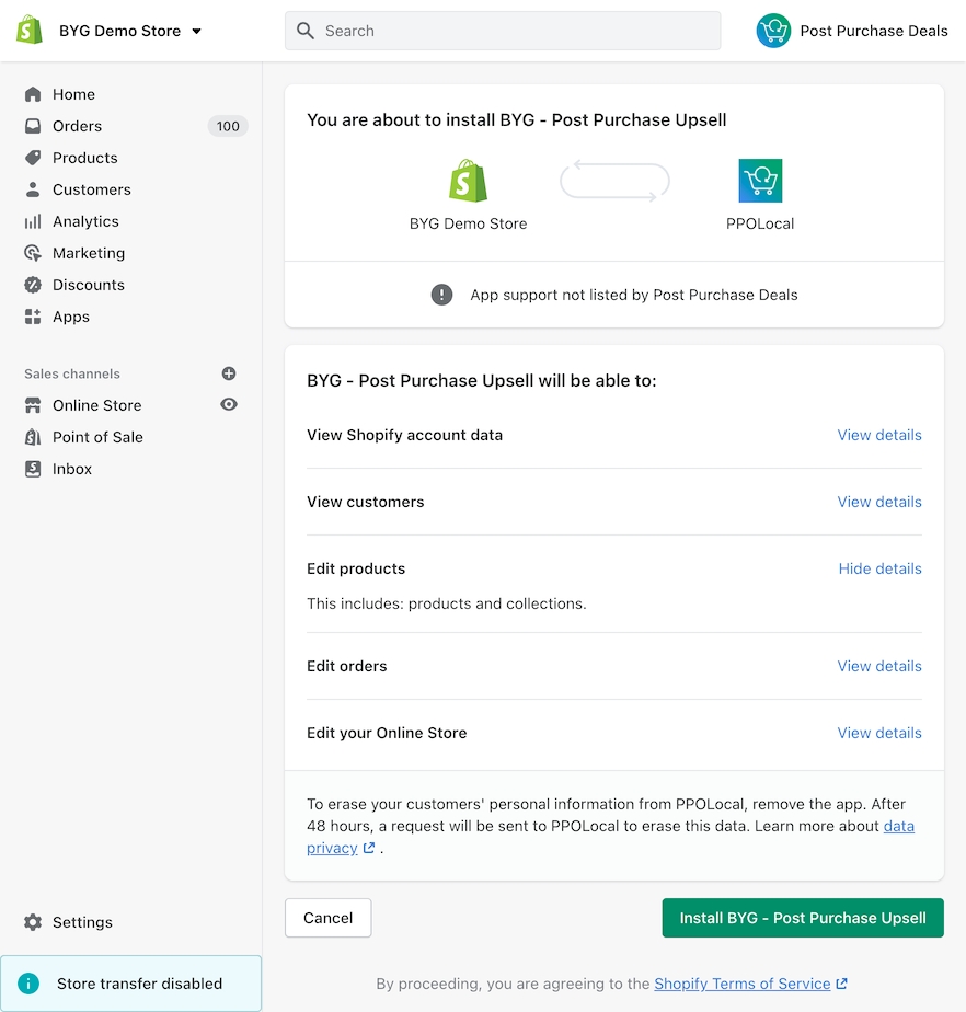 Upon installation BYG will ask you to authorize it allow access to your Shopify store. The authorization page will also show you permissions we ask for, they are: