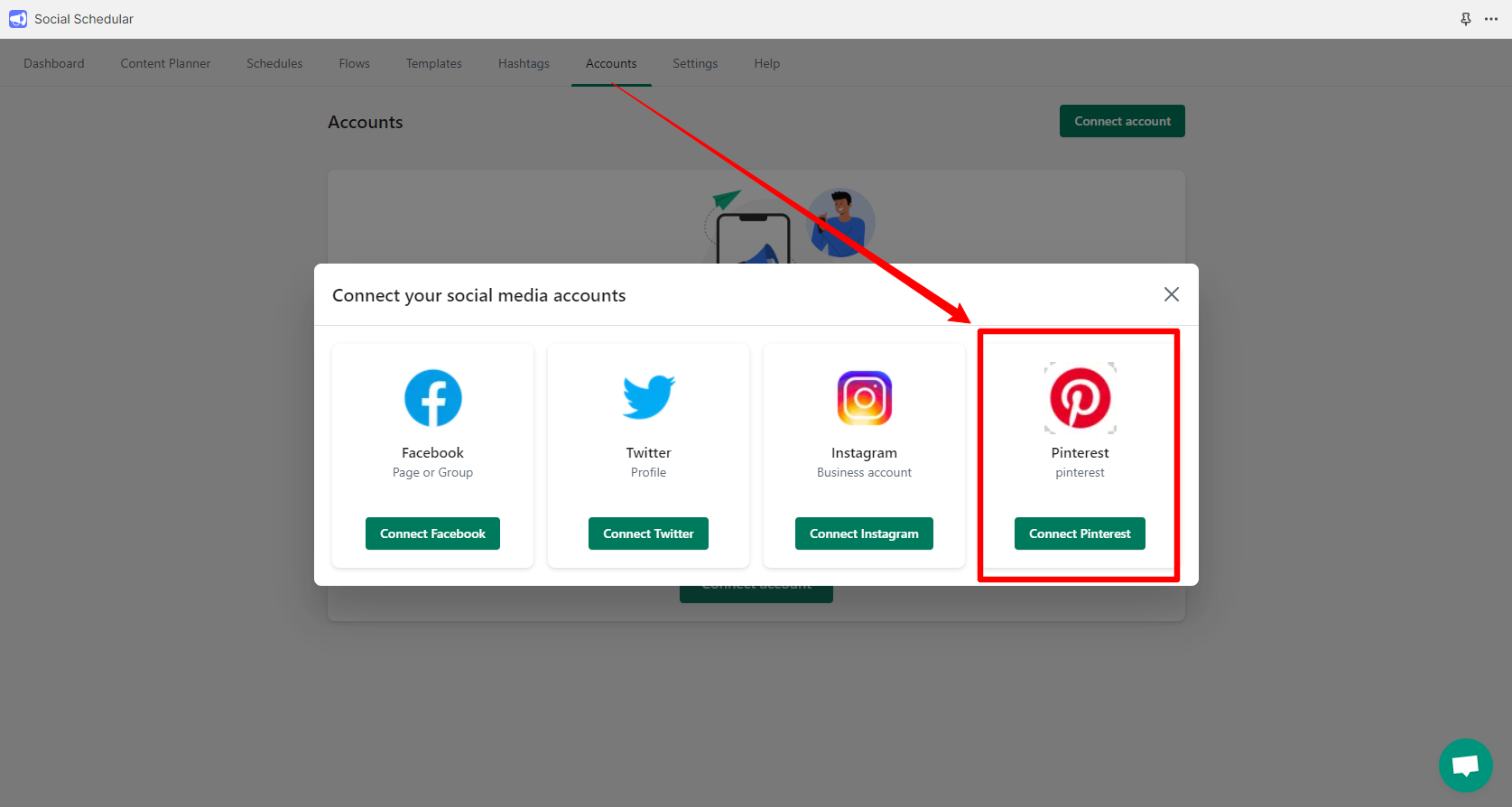 4. Select "Connect Pinterest" <img src="https://831484437-files.gitbook.io/~/files/v0/b/gitbook-x-prod.appspot.com/o/spaces%2FFlKzPJEUobIs5CPvwlhm%2Fuploads%2FrDGvBFLP5XqyQNU9XOGc%2Fpngegg%20(1).png?alt=media&#x26;token=913819ab-a7e9-4caa-abc9-9f80699b0ab4" alt="" data-size="line">