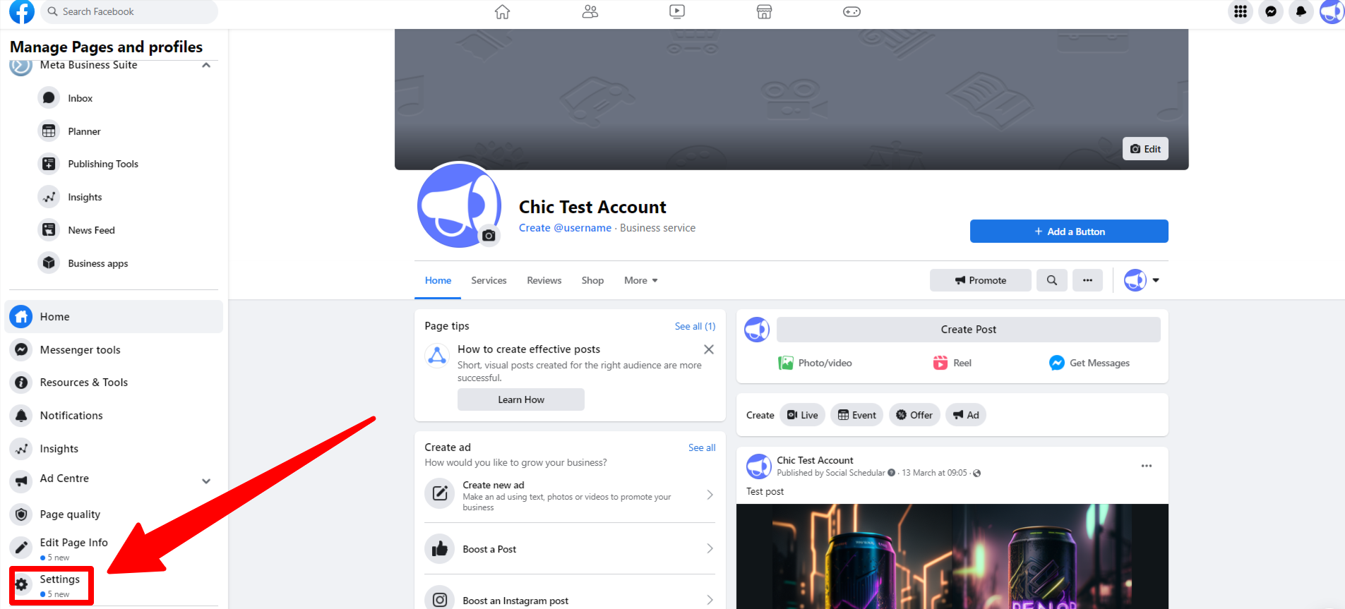 2. Once you're in your Page, click ***Settings*** in the left hand sidebar.<br>